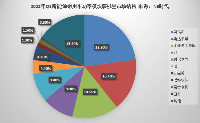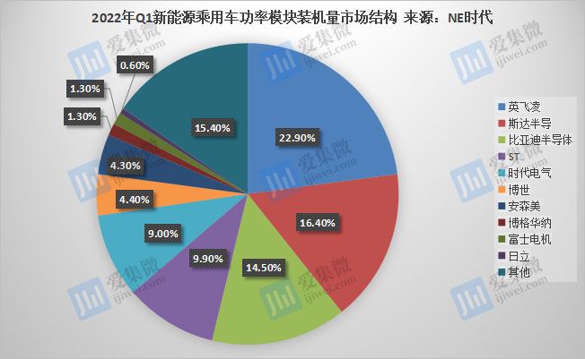 根據(jù)NE時代統(tǒng)計數(shù)據(jù),2022年Q1中國新能源乘用車功率模塊裝機量榜首仍是英飛凌,其以25.3萬套位列行業(yè)第一,其后2-4名分別為斯達半導(dǎo)、比亞迪半導(dǎo)體、ST、時代電氣,裝機量分別為18.2萬套、16.1萬套、10.9萬套、10萬套。值得注意的是,斯達半導(dǎo)、比亞迪半導(dǎo)體及時代電氣三家本土企業(yè)三家本土企業(yè)同比增速分別為203.3%、209.6%、>500%,遠(yuǎn)高于英飛凌78.2%的同比增速;合計裝機量為44.3萬套,合計市場份額已達39.9%。
