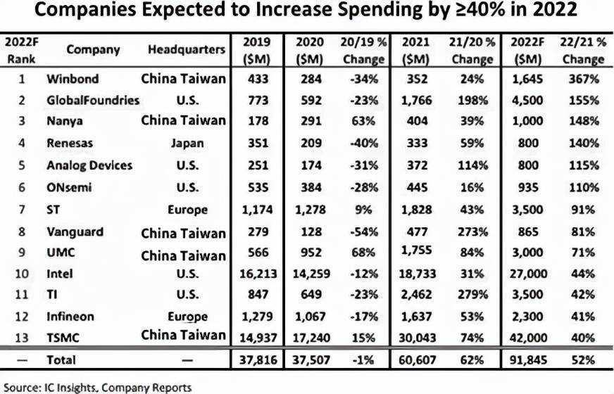 上圖中13家公司的總支出預(yù)計(jì)將是兩年前2020年的近2.5倍。支出的大幅度增長(zhǎng),主要是由于當(dāng)前市場(chǎng)激增的需求導(dǎo)致的供不應(yīng)求,未來(lái)隨著需求的逐步被滿足,未來(lái)半導(dǎo)體公司的支出根據(jù)銷(xiāo)售情況會(huì)進(jìn)行調(diào)整。